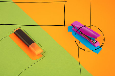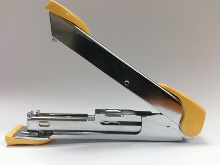 Stapler with paper clips on yellow background. Minimalism. Top view
