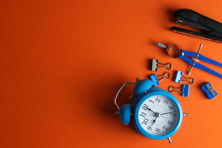 Pencils, blue alarm clock, compass, ruler and stapler on an orange background.