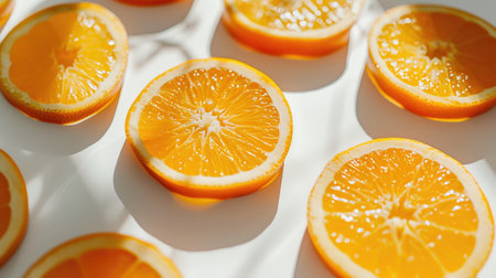 A top-down view showcases numerous vibrant orange slices, each with visible segments and a star-like center, arranged in a visually appealing pattern on a cool, reflective surface.
