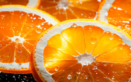 High view of fresh slices of oranges with water droplets. Studio shot.