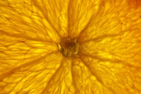 Top view of a half orange fruit on an orange colored background