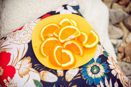 Various pieces of orange on a yellow background, juicy fruit