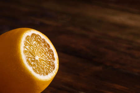 Macro shot fresh juicy lemon on a dark wooden background. Citrus close-ups