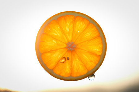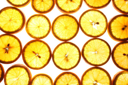 Round slices of fresh juicy orange on a luminous light surface. Healthy food concept