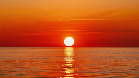 A stunning sunrise bathes the ocean in vibrant red light as clouds reflect the colors above. Waves gently lap the shore creating a peaceful atmosphere at dawn. Humidity haze over water. Generative AI