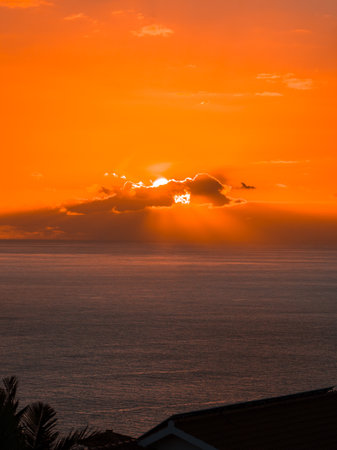 Sunset over Atlantic near Funchal, Madeira with sunbeams and rooftops