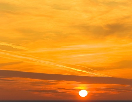 Large sun setting over horizon, casting intense orange and red hues across the sky