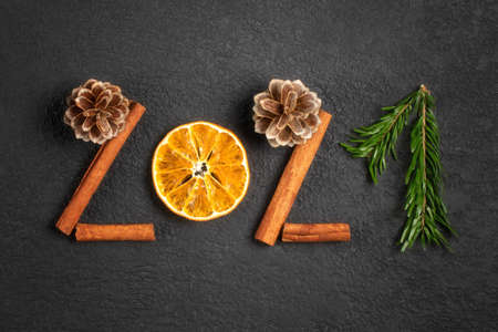 Christmas celebration with zero waste concept. Christmas eco friendly decoration. Figures 2021 from natural materials on a black table