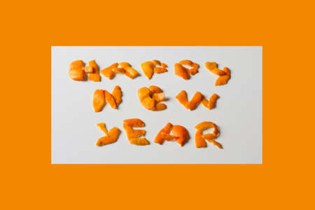 Happy New Year. Defocus New year word displayed by orange dry peel on a gray background. Decoration for New Year. Greeting card. Text and DIY letters. Orange border and frame. Holiday. Out of focus.