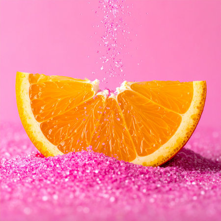 A bright orange slice is sprinkled with pink glitter on a pink background. Clear details and vibrant colors e...