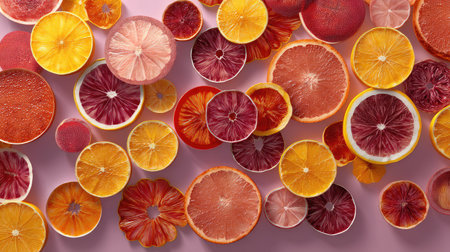 A stunning arrangement of vibrant citrus fruit slices beautifully displayed on a pink backdrop, showcasing freshness and zest for healthy culinary creativity.