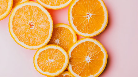 sliced oranges on pink background, vibrant composition. Freshness and health concept