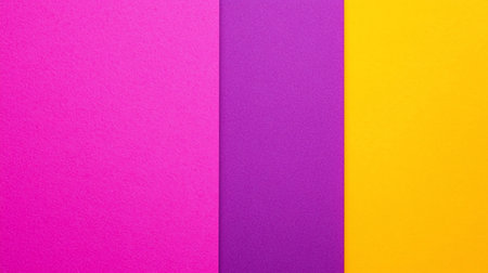 Vibrant abstract composition of three vertical paper strips: fuchsia, violet, and golden yellow, each with a subtle textured surface.