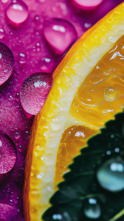 Fresh citrus slices glistening with water drops on vibrant purple background