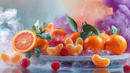 A captivating display of fresh fruits, including oranges and raspberries, arranged elegantly on a gray plate. Colorful smoke enhances the vibrant aesthetic, creating a striking visual appeal perfect for food photography.