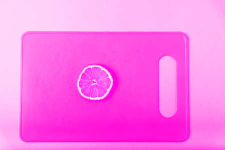 Top down view on pink abstract background with slices of ripe orange or lemon citrus in pattern - trendy minimal flat lay food summer concept