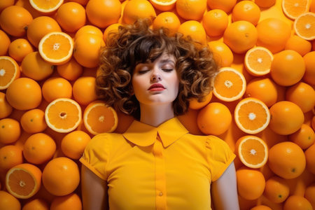 A woman lies in slices of an orange. Concept of skin health thanks to vitamin C.