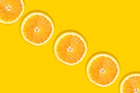 A visually appealing arrangement of freshly cut orange slices on a cheerful yellow background, showcasing vibrant colors, textures, and the essence of healthy eating.