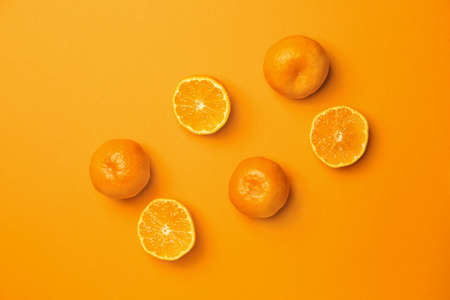 Tangerine on an orange background, fruit flatlay, summer minimal compositon top view
