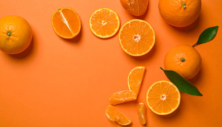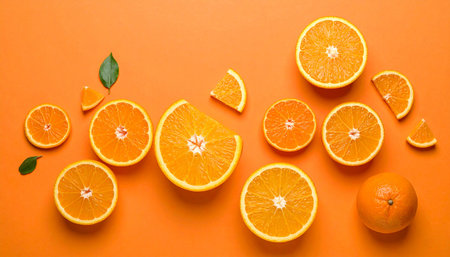 Explore the vibrant allure of fresh orange slices arranged on a bold orange background, ideal for healthy lifestyle themes in food photography.