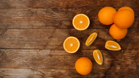 Oranges lie on a wooden surface. Wooden background. Grunge texture background. Poster design. Nature background. Sweet fruit. Design element. Concept of product design. Tropical fruit