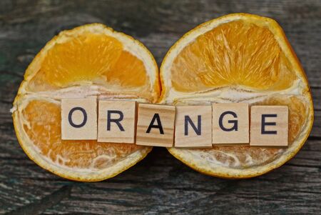 Orange fruit. Orange half fruit sliced isolate on yellow background seen from above flatlay style, close up.