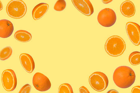 Frame of sliced fresh orange isolated on light yellow background. Vitamins, healthy diet and detox concept. Sliced orange floating in the air. Minimal creative concept fruit concept with free space for text.