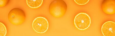 top view of ripe juicy whole oranges and slices on colorful background, panoramic crop