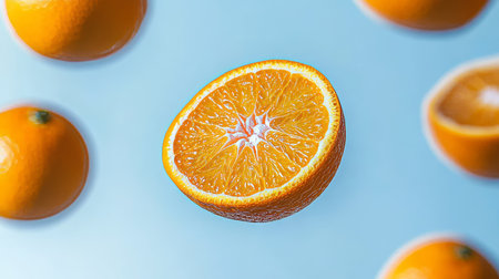 Fresh Sliced Orange Falling Among Floating Oranges, Minimalist Style, With Copy Space