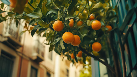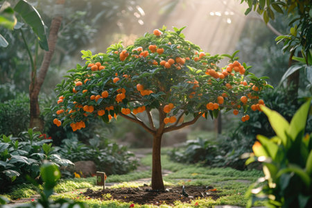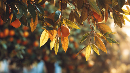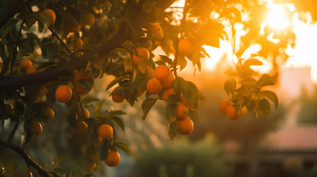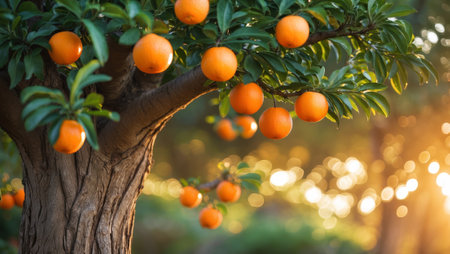 Bright orange fruits hang from a lush tree in a sunlit garden showcasing natures bounty during golden hour