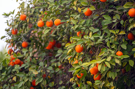 Low-key view of lush orange tree heavy with ripe citrus fruit in an orchard, dark green foliage and branches packed with mandarin oranges, natural agriculture harvest scene outdoors