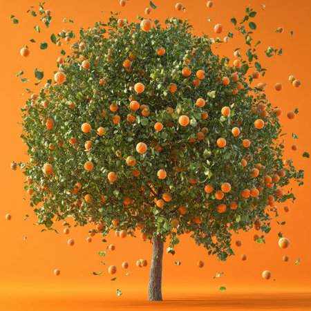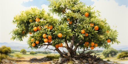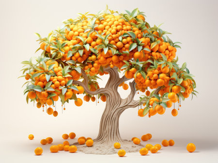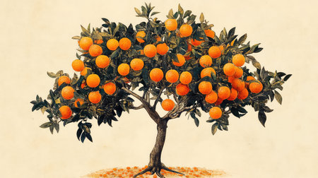 An enchanting illustration of a lush orange tree laden with bright fruit, set against a light backdrop, capturing the essence of nature's bounty.