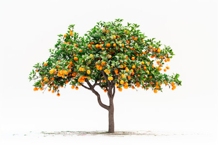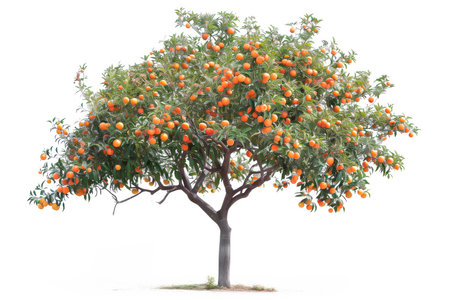 Tangerine or orange tree isolated on white background. The citrus fruits hang heavy on the branches, ready for picking in the sunny orchard.