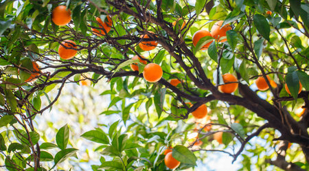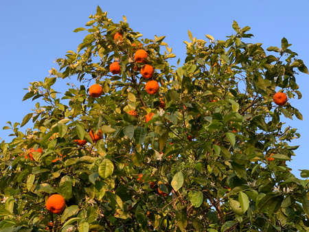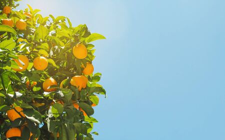 Orange tree with ripe fruit in the sunlight in summer. Blue sky in the background. Landscaped photography. Outdoor photography.