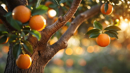 Oranges hang on a sunlit tree during golden hour in a lush orchard under warm evening light