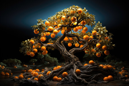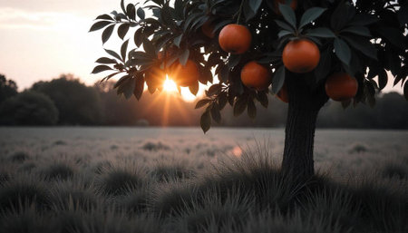 A surreal image of an orange tree with ripe fruit against a sunset sky