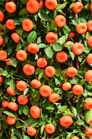 Close-up of the mandarin tree. Chinese traditional plant and fruit for Chinese New Year celebration, for fortune. Festive decoration and celebration. Chinese New Year decoration.