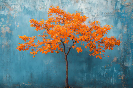 Artistic depiction of a tree with vibrant orange leaves against a striking blue backdrop