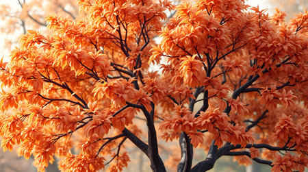 A stunning image capturing the essence of autumn. The tree's leaves are a vivid orange, illuminated by the sun, creating a visually appealing scene. A perfect representation of the season's beauty.