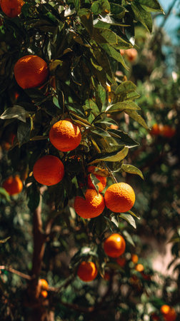 A close-up view of fresh oranges hanging from their tree, surrounded by vibrant green leaves. This image captures the essence of natural beauty in a fruit orchard.
