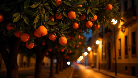 Orange trees illuminate quiet city street at dusk or night
