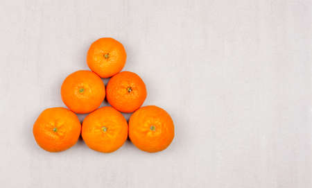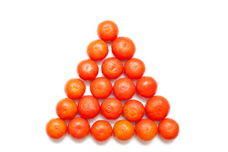 Ripe fresh tangerines laid out in a triangle shape on a white background