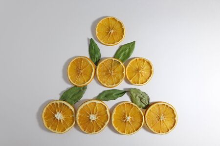 Sliced and dried oranges and lemons are laid out on a white background in the shape of a Christmas tree. Horizontal orientation. The view from the top.