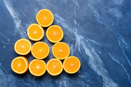 High vitamin C, Juicy and sweet. Fresh orange fruit on blue background. Top view
