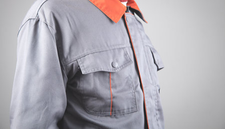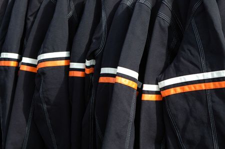 Bright orange uniform for outdoor work with reflective inserts hang on the wall near the tools.