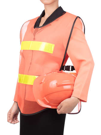 woman civil engineer in orange shirt holding safety helmet of construction isolated on white background
