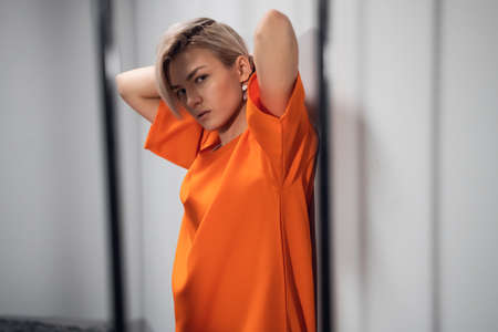 Young beautiful blonde is serving time with a womens prison in solitary confinement.