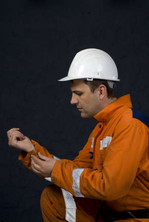 A man in work clothes holds an orange protective helmet and yellow gloves on a blue background in his hand. Free space for the inscription.