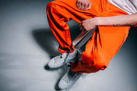 Top view of man in orange pants with cuffs on legs sitting on stool on dark background