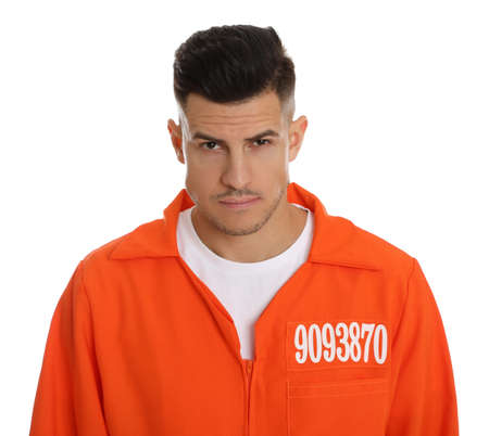 bearded man in jail uniform looking at camera near blurred african american juryman